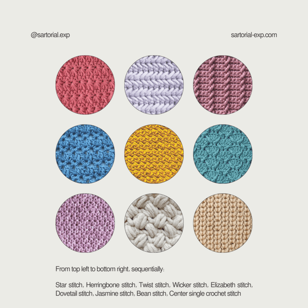 With just a few basic stitches—such as the chain, single crochet, and double crochet—you can create scarves, blankets, bags, and even intricate lacework. The process is rhythmic and meditative, offering relaxation and creativity in equal measure. Whether crafting for yourself or gifting handmade treasures, crochet is an art that connects generations and provides endless possibilities for expression. There are over 150 crochet stitches, here are a few examples: